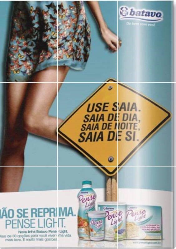 - A parte inferior do cartaz tem o fundo branco, estão representados quatro produtos, estes têm o mesmo slogan do produto com letras cor de roxo ("Pense Light"). O suporte do sinal permanece até à parte inferior do cartaz, dando ideia que está atrás dos produtos. Na parte inferior em letras azuis turquesa tem a frase ("Não se reprima Pense Light"), "não se reprima". Em baixo com letras mais pequenas na mesma cor, tem afrase ("Nova linha Batavo pense light, Mais de 30 opções para você viver uma vida mais leve. E muito mais gostosa").